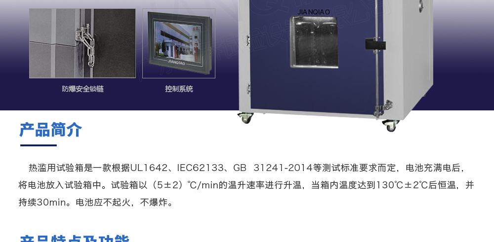 用途:熱濫用試驗(yàn)箱是一款根據(jù)UL1642、IEC62133等測(cè)試標(biāo)準(zhǔn)要求而定,電池充滿電后,將電池放入試驗(yàn)箱中。試驗(yàn)箱以(5±2)℃/min的溫升速率進(jìn)行升溫,當(dāng)箱內(nèi)溫度達(dá)到130℃±2℃后恒溫,并持續(xù)